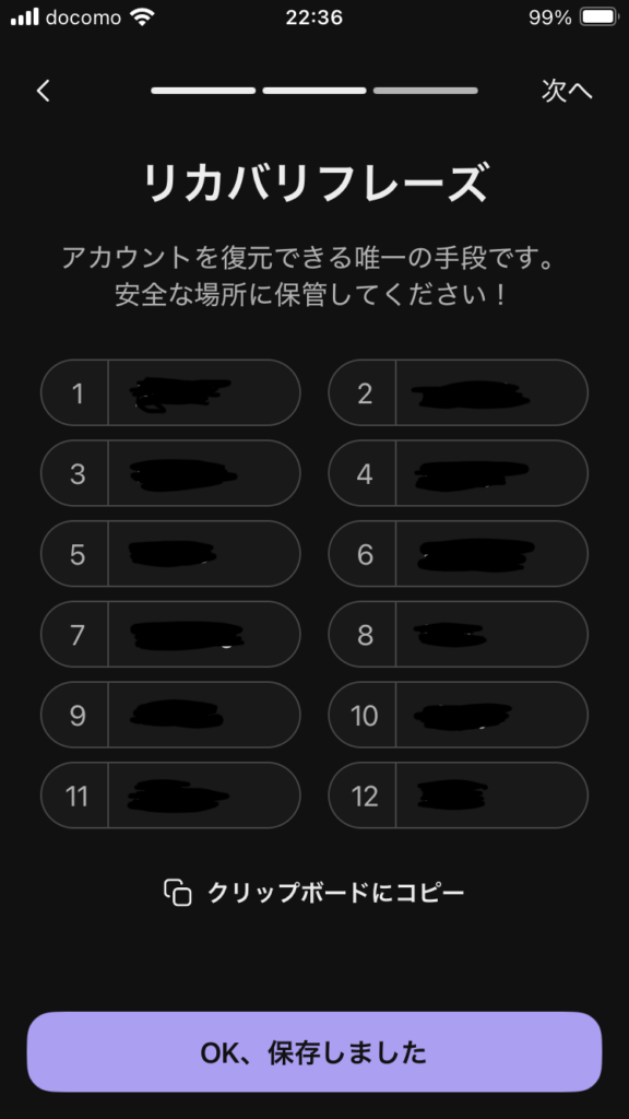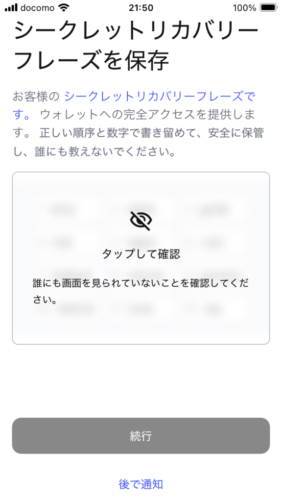 STEP5:シークレットリカバリーフレーズを保存する【最重要】