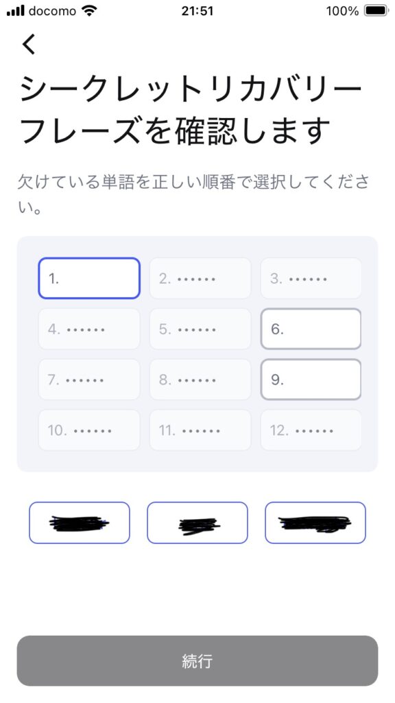STEP5でメモした「シークレットリカバリーフレーズ」と同じ配置にあるフレーズを選択し、確認します。
