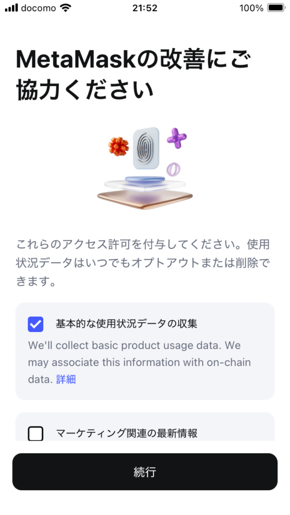 MetaMaskの改善に関するデータ送信の確認画面が表示されます。